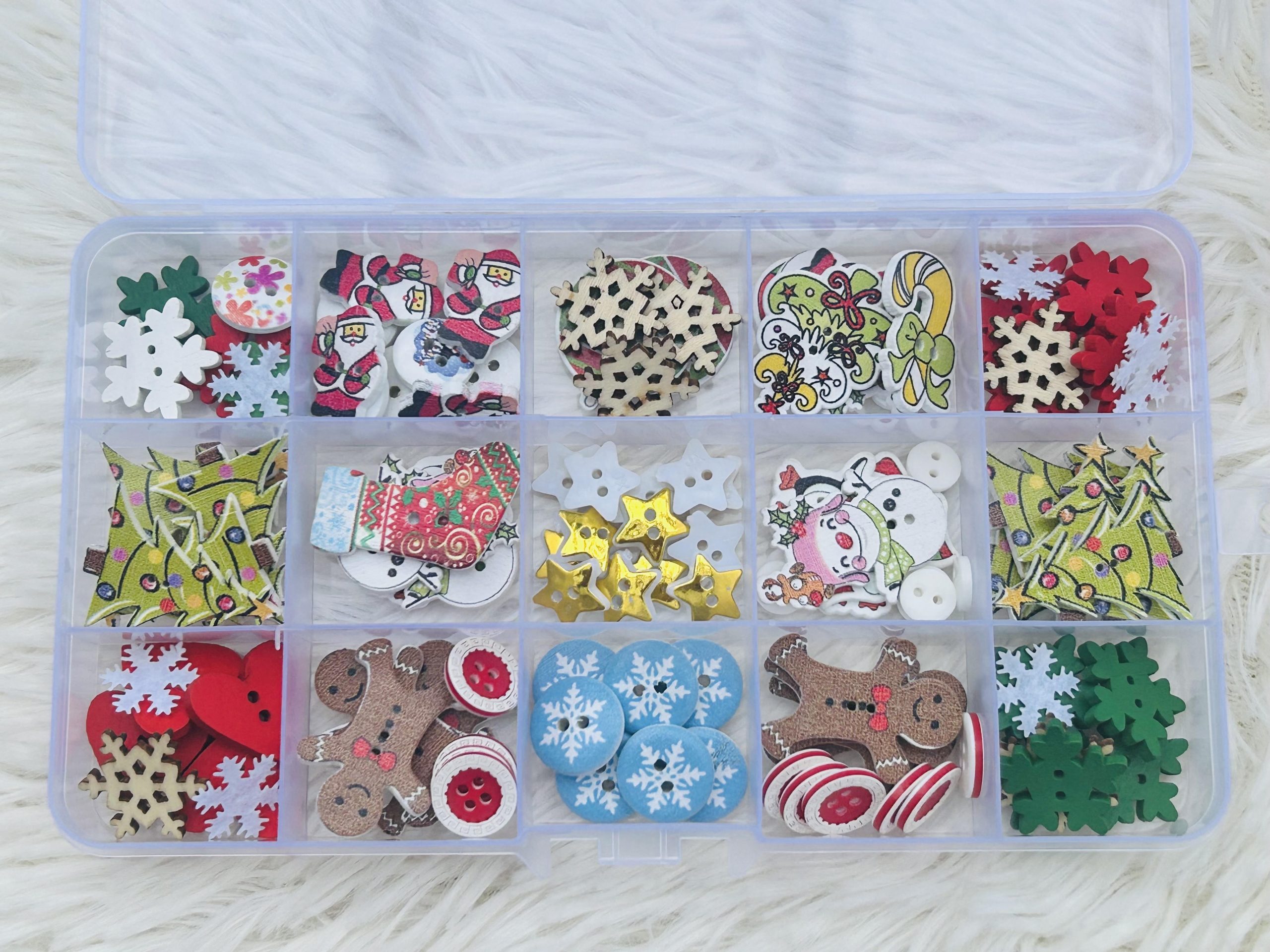 Caja de botones de color madera, resina y copos de nieve de fieltro.