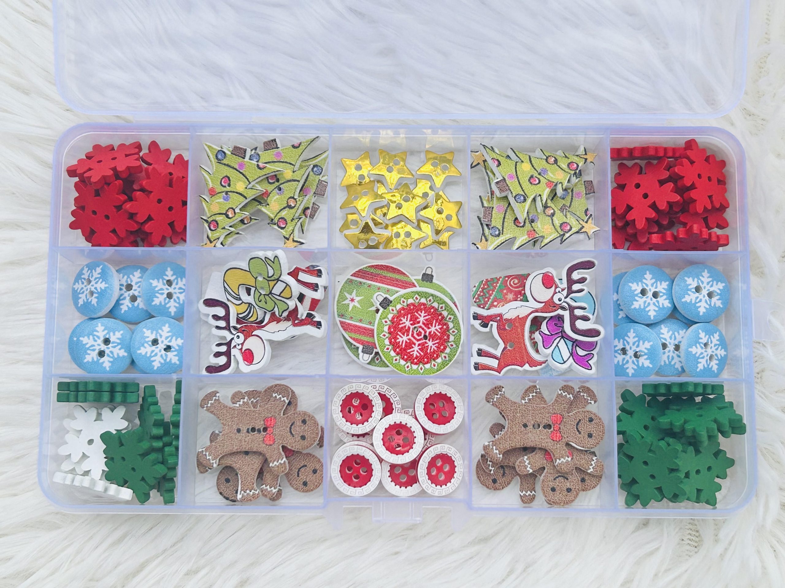 Caja de botones de madera y resina con diseño de navidad. Incluye 100 botones surtidos y caja organizadora de 15 divisiones.